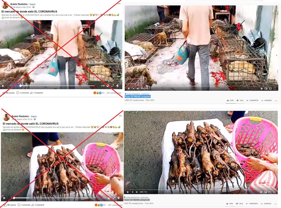 Las entradas, compartidas más de 4.000 veces en dos días, se multiplican en Facebook (1, 2, 3, 4, 5 y 6) y en Twitter. Todas incluyen el video de una ajetreada feria de venta de todo tipo de animales, vivos y muertos, y aseguran que las imágenes fueron tomadas en China y que en ese mercado se originó el coronavirus.