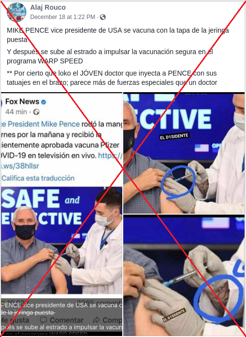 “MIKE PENCE vice presidente de USA se vacuna con la tapa de la jeringa puesta. Y después se sube al estrado a impulsar la vacunación segura en el programa WARP SPEED”, indica una publicación en Facebook (1) sobre la foto del vicepresidente.