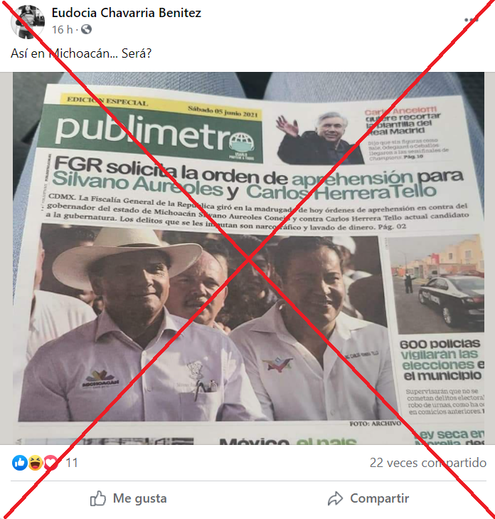 “MÁS MEDIOS DE PRESTIGIO ANUNCIAN DETENCIÓN DE SILVÁNDALO Y DIVO HERRERA”, dicen publicaciones en Facebook (1, 2, 3) sobre la supuesta orden de aprehensión emitida por la Fiscalía General de la República (FGR) al gobernador de Michoacán, Silvano Aureoles, y a Carlos Herrera Tello, candidato a sucederle por la coalición Va por México, conformada por el Partido Acción Nacional (PAN), el Partido Revolucionario Institucional (PRI) y el Partido de la Revolución Democrática (PRD).