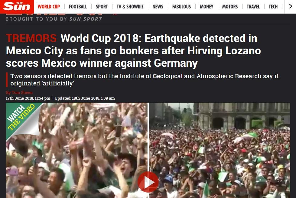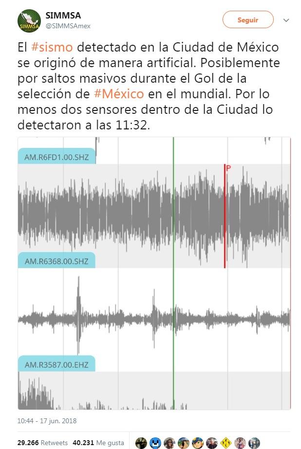 Un tuit, 9 minutos después del gol del mexicano Hirving “Chuky” Lozano, dio la vuelta al mundo. La información aseguraba que se había registrado un “sismo artificial” en la Ciudad de México debido a “los saltos masivos” de la afición, tras el marcador que volvió a México el campeón del encuentro del balompié sobre Alemania. Pero no hay registros oficiales que sustenten la información retomada por la prensa internacional.