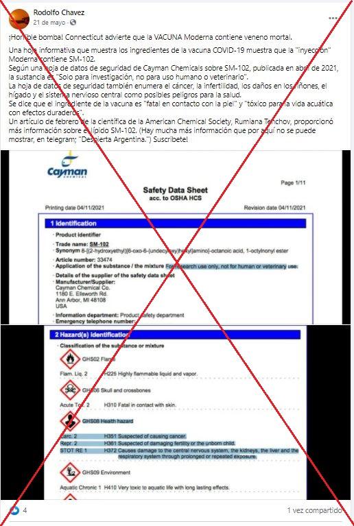 Las entradas toman como referencia “una hoja de datos de seguridad de Cayman Chemicals sobre SM-102, publicada en abril de 2021”, la cual asegura que “la sustancia es ‘solo para investigación, no para uso humano o veterinario’”.