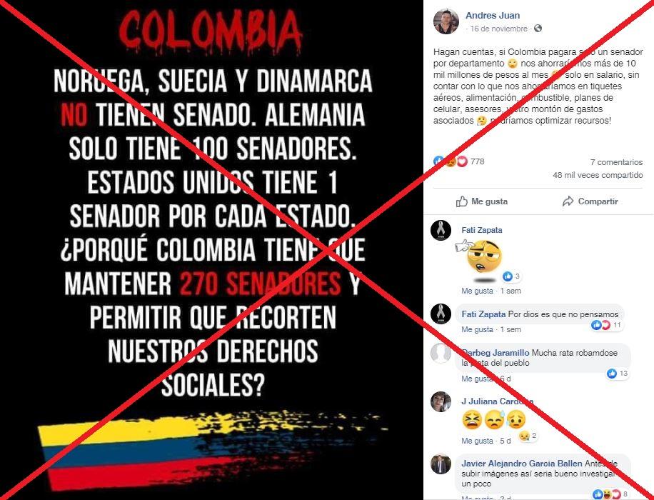 “Hagan cuentas, si Colombia pagara solo un senador por departamento nos ahorraríamos más de 10 mil millones de pesos al mes solo en salario”, asegura el autor de la publicación viral, que viene acompañada de una imagen con un texto sobre la cantidad de miembros que tienen los senados de varios países, entre estos Colombia.