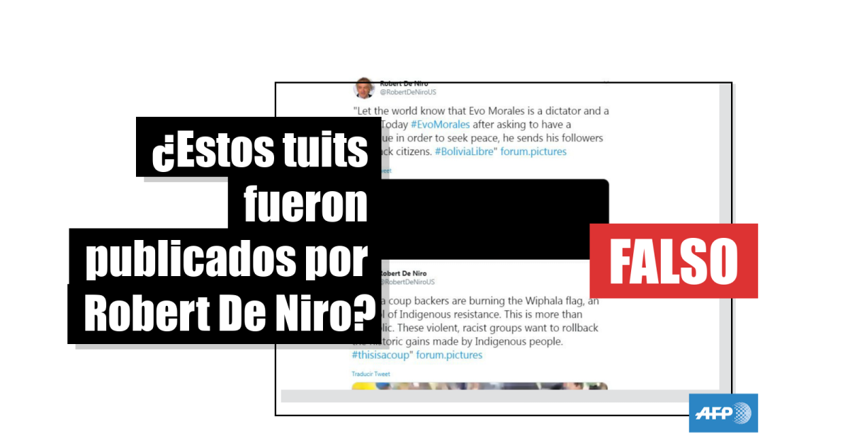 Las notas mencionan dos tuits supuestamente publicados por De Niro. "Los golpistas de Bolivia están quemando la bandera de Wiphala, un símbolo de resistencia indígena. Esto es más que simbólico. Estos grupos violentos y racistas quieren revertir los logros históricos de los pueblos indígenas", afirma una de las publicaciones. "Que el mundo sepa que Evo Morales es un dictador y un asesino. Hoy #EvoMorales Después de pedir un diálogo para buscar la paz, envía a sus seguidores a atacar a los ciudadanos. #BoliviaLibre", señala la otra.