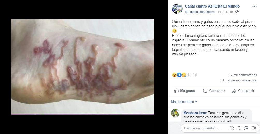 “Quien tiene perros y gatos en casa cuidado al pisar los lugares donde se hace pipí aunque ya esté seco Esto es larva migrans cuátea… un parásito presente en las heces de los perros y gatos infectados”, se lee en publicaciones acompañadas de la fotografía de un pie humano supuestamente infectado.