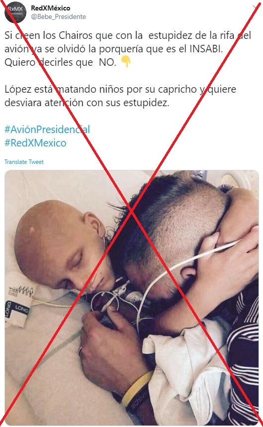 La misma imagen fue usada para acompañar la opinión de usuarios en esta red social sobre la situación que viven los niños en México, aludiendo a “niños enfermos sin medicamento” o al funcionamiento del Instituto de Salud para el Bienestar (INSABI), nuevo sistema de salud implementado por el gobierno de México.