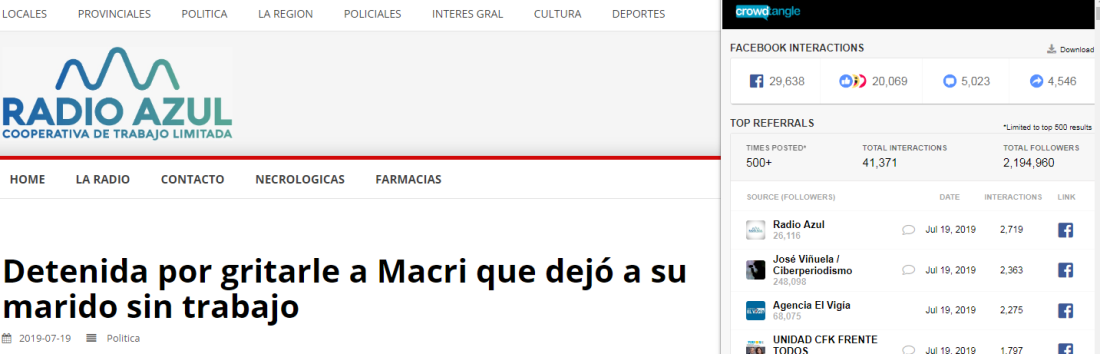 La información fue compartida 1.900 veces en Facebook (1, 2, 3) y en Twitter, donde un mensaje de un periodista argentino superó los 2.800 retuits. Además, la nota del medio local Radio Azul llegó a tener más de 29.000 interacciones, según CrowdTangle, una herramienta utilizada para medir la viralización de los contenidos que circulan en redes sociales.