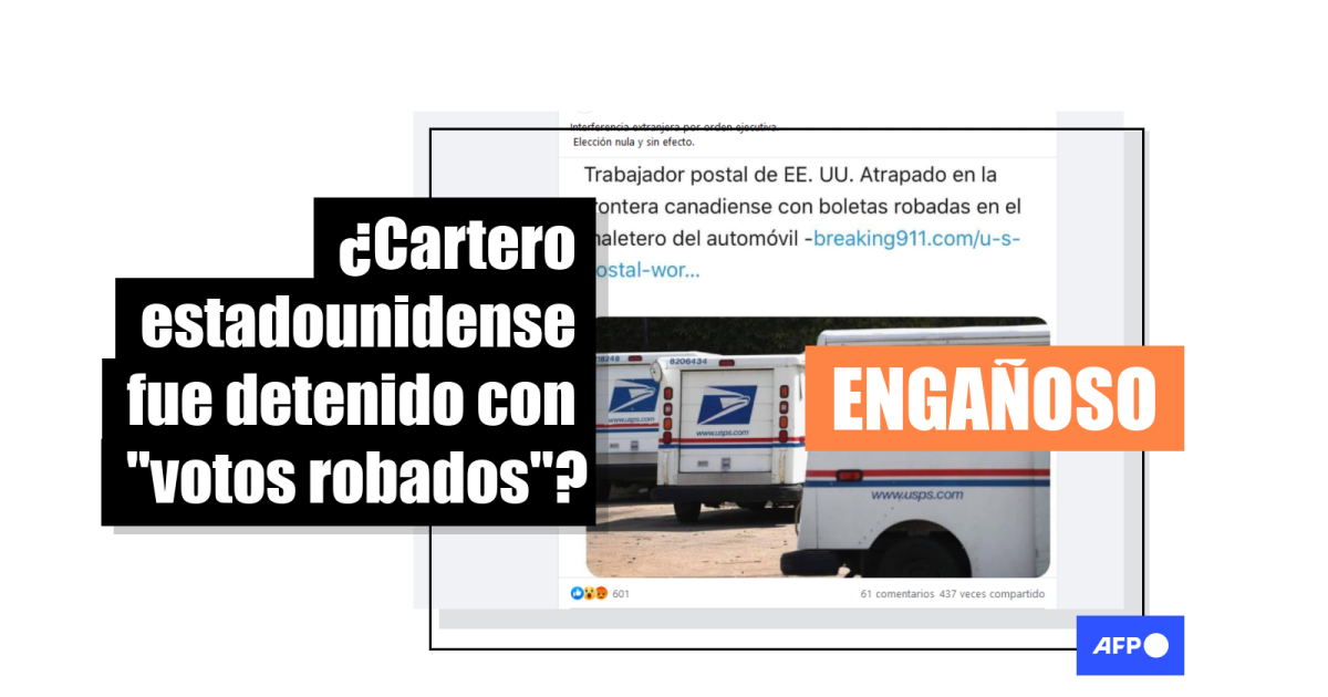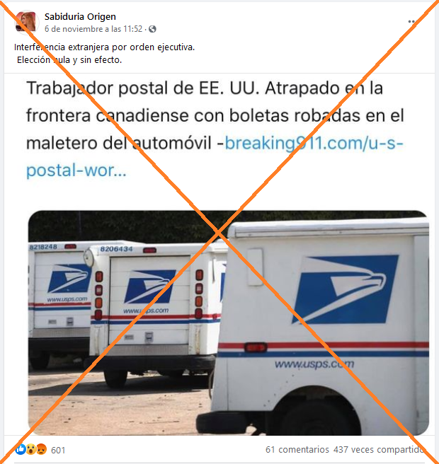 “Interferencia extranjera por orden ejecutiva. Elección nula y sin efecto”, se lee en una publicación en Facebook acompañada de una foto que muestra camiones de la empresa estadounidense de correos USPS y el titular “Trabajador postal de EE.UU. atrapado en frontera canadiense con boletas robadas”.