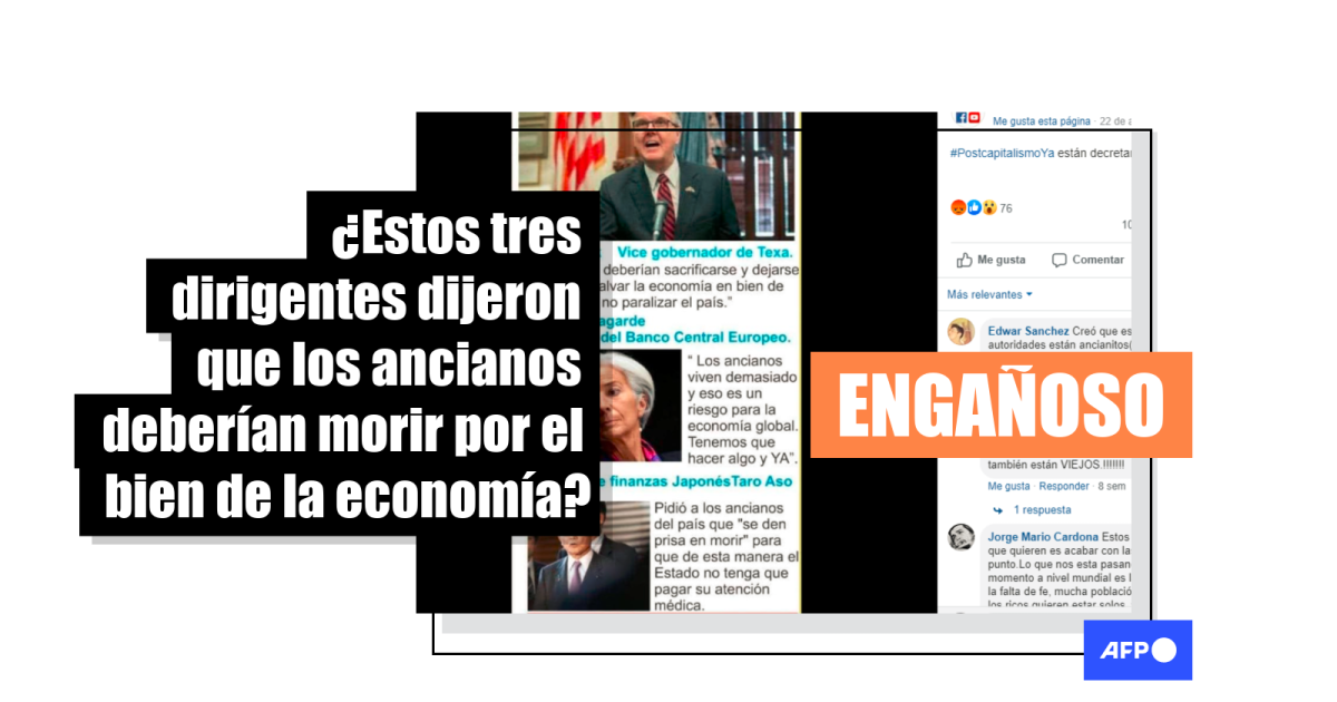 “Los abuelos deberían sacrificarse [...]”, “los ancianos viven demasiado [...]” o “[los mayores] deben darse prisa en morir [...]” son parte de las tres frases atribuidas a los tres dirigentes en la imagen que circula en Facebook (1, 2, 3) desde el 12 de abril, en plena pandemia mundial por el nuevo coronavirus. Las publicaciones han sido compartidas más de 1.000 veces desde esa fecha. La imagen también circula en Twitter.