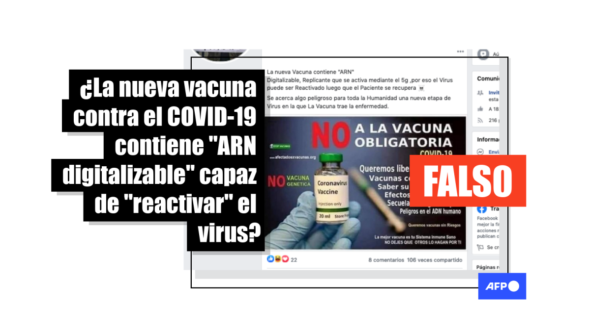 “La nueva Vacuna contiene ‘ARN’ Digitalizable, Replicante que se activa mediante el 5g, por eso el Virus puede ser Reactivado luego que el Paciente se recupera [sic]”, asegura una publicación en Facebook (1, 2) “Se acerca algo peligroso para toda la Humanidad una nueva etapa de Virus en la que La Vacuna trae la enfermedad”.