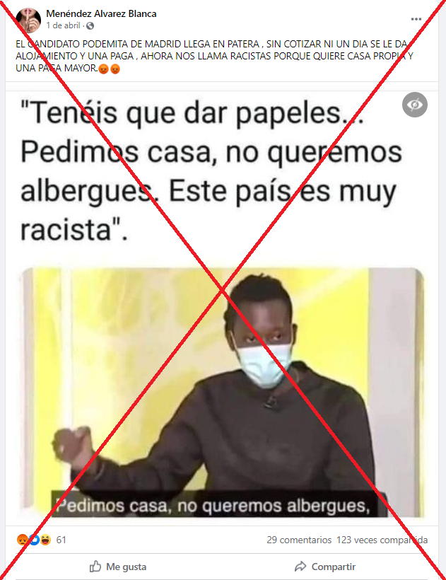 “EL CANDIDATO PODEMITA DE MADRID LLEGA EN PATERA, SIN COTIZAR NI UN DIA SE LE DA ALOJAMIENTO Y UNA PAGA, AHORA NOS LLAMA RACISTAS PORQUE QUIERE CASA PROPIA Y UNA PAGA MAYOR”, sostienen las publicaciones en Facebook (1, 2, 3).