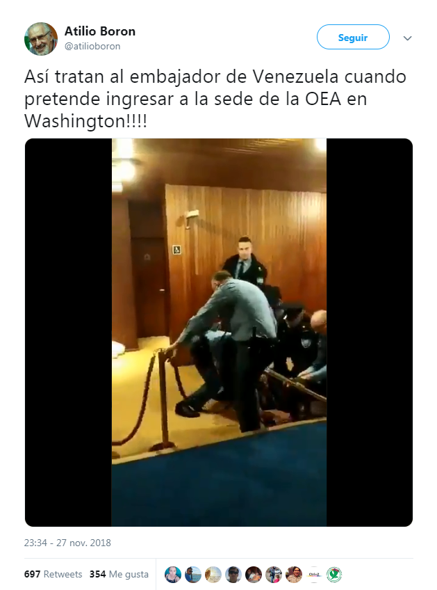 “¡Así tratan al embajador de Venezuela cuando pretende ingresar a la sede de la OEA en Washington!”, afirma el usuario que publicó el video en Twitter el 27 de noviembre de este año.