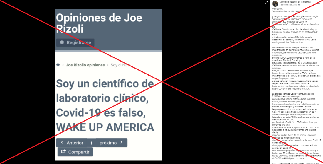 En la publicación, el supuesto científico afirma que cuando él y su equipo analizaron 1.500 muestras encontraron que “eran principalmente Influenza A y algunas eran Influenza B, pero ni un solo caso de Covid”. “Ahora llegamos a la firme conclusión, a través de toda nuestra investigación y trabajo de laboratorio, que COVID 19 era imaginario y ficticio”, dice. “Entonces, lo que estamos tratando es simplemente otra cepa de gripe como cada año, COVID 19 no existe y es ficticio”, concluye.