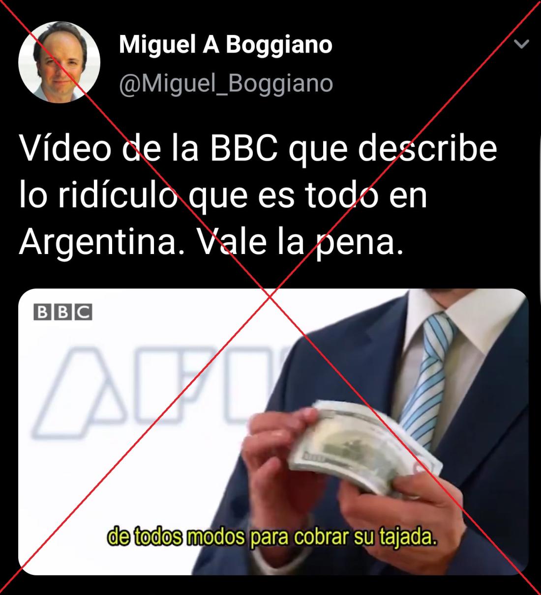 El pasado 13 de enero a las 11.32 GMT, el economista argentino Boggiano publicó el video en Twitter con el texto "Video de la BBC que describe lo ridículo que es todo en Argentina. Vale la pena".