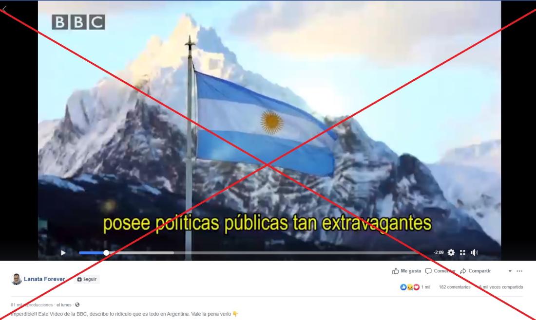 "Imperdible!! Este Vídeo de la BBC, describe lo ridículo que es todo en Argentina. Vale la pena verlo", afirma una publicación en Facebook compartida más de 6.000 veces desde el 13 de enero de 2020. El texto acompaña un video de 2.20 minutos que ha sido reproducido más de 80.000 veces.
