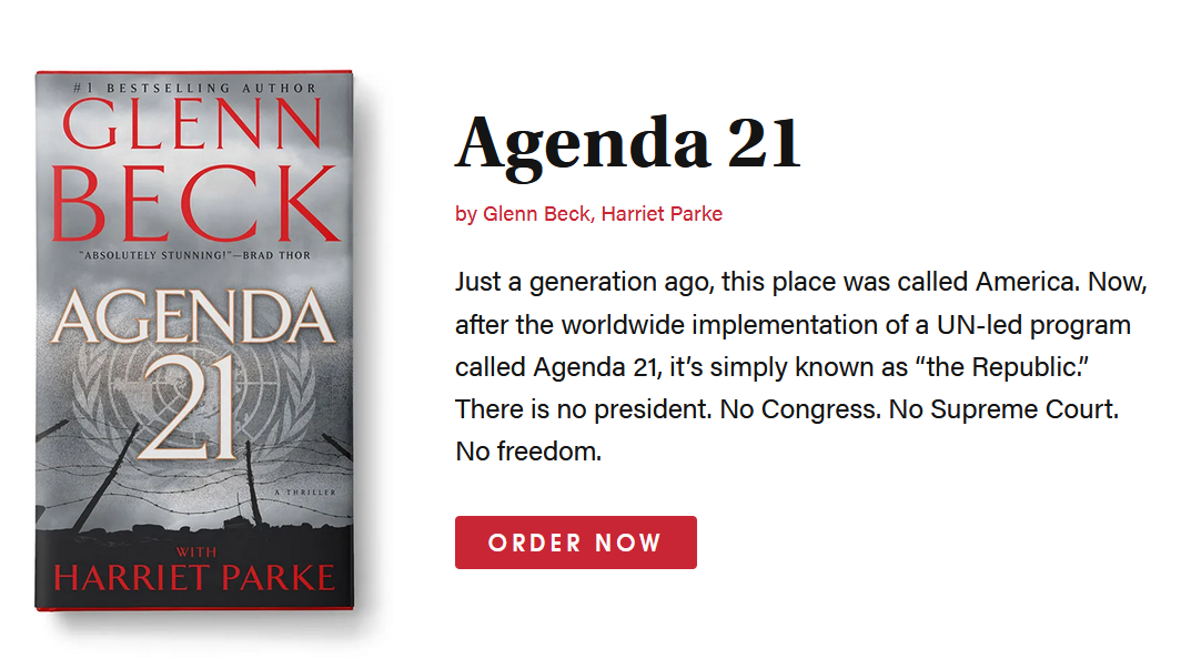 Una nueva búsqueda por palabras clave reveló que Glenn Beck, junto a Harriet Parke, es el autor de una novela titulada “Agenda 21”, publicada a fines de 2012 por una alianza entre el sello Threshold Editions y la propia compañía productora de Beck, Mercury Radio Arts.