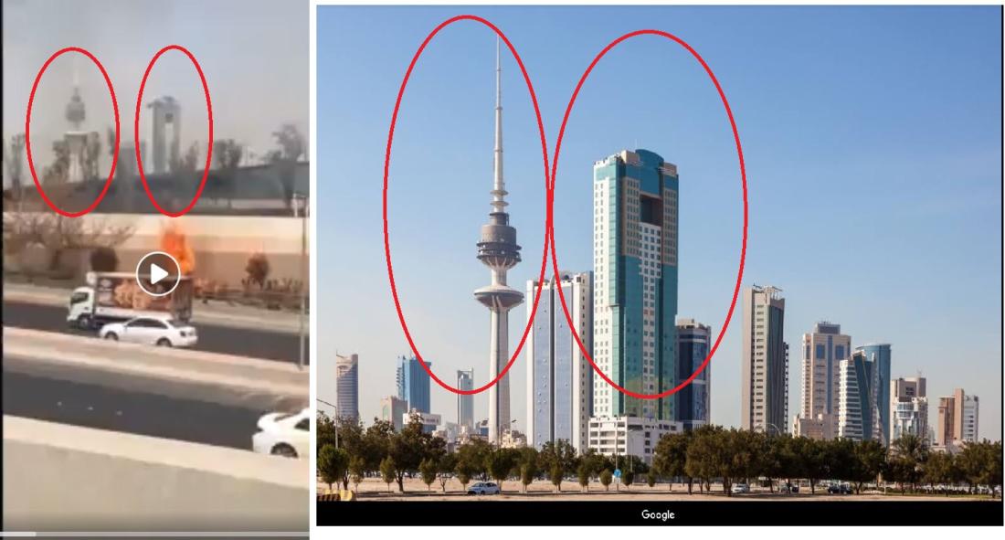 En la primera secuencia del video se puede ver el incendio de unos arbustos secos al costado de una carretera. Al fondo se observan dos edificios. El de la izquierda, según AFP Factual pudo corroborar con Google Maps, es la Torre de la Liberación, en Kuwait